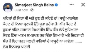 वही बैंस ने ट्वीट भी किया है, जिसमें लिखा है, “पहले भी कहा था और कहते है.. हमें माननीय कोर्ट की न्याय प्रणाली पर पूरा भरोसा है। आज कोर्ट के आदेशों के तहत सिमरजीत सिंह बैंस द्वारा लुधियाना कोर्ट में आत्म समर्पण कर दिया गया और जो भी सच है… बहुत जल्द सभी के सामने आ जाएगा… लोक इंसाफ पार्टी।