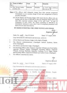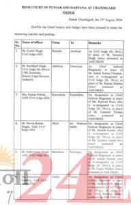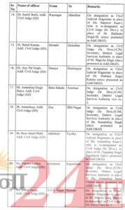 जालंधर (R24N): इस संबंध में आदेश जारी करते हुए 52 जजों (Judge) के तबादले की सूची जारी की गई है। जिन जजों के तबादले हुए हैं। उनके नाम की लिस्ट यह है। 👇