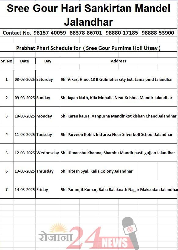 जालंधर (R24N): श्री चैतन्य महाप्रभु जी के शुभ प्रकट उत्सव पर श्री गौर हरि संकीर्तन मंडल की ओर से 8 मार्च से लेकर 14 मार्च तक प्रभात फेरियों का आयोजन किया जा रहा है। संकीर्तन मंडली के प्रधान दिनेश सनी दुआ ने बताया कि प्रभात फेरी शहर के अलग-अलग स्थानों की परिक्रमा करेंगी और श्री गौरी हरि संकीर्तन मंडल द्वारा हरिनाम संकीर्तन किया जाएगा।