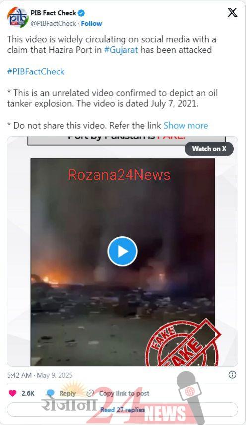 सोशल मीडिया पर वायरल हो रहे एक वीडियो में दावा किया जा रहा है कि पाकिस्तान ने गुजरात के हजीरा पोर्ट और जालंधर में ड्रोन से अटैक किया है। PIB के फैक्ट चेक के अनुसार, यह वीडियो 7 जुलाई 2021 का है। यह गुजरात के हजीरा पोर्ट का नहीं बल्कि एक ऑयल टैंकर में आग का वीडियो है। पाकिस्तान ने इस सालों पुराने वीडियो का इस्तेमाल झूठ फैलाने के लिए किया है।