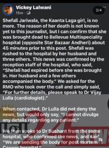 बताया जा रहा है कि 27 जून की रात को शेफाली को अचानक सीने में तेज दर्द की शिकायत हुई, जिसके बाद पति पराग त्यागी और अन्य लोग मिलकर उन्हें तुरंत मुंबई के अंधेरी इलाके में स्थित हॉस्पिटल ले गए, जहां डॉक्टर्स ने एक्ट्रेस को मृत घोषित कर दिया। इस दुखद की पुष्ट अस्पताल के रिसेप्शनिस्ट ने कर दी है।