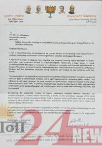 जालंधर (R24N): पंजाब प्रदेश भाजपा युवा मोर्चा के मीडिया सचिव प्रशांत गंभीर ने केंद्रीय रेलवे मंत्री अश्विनी वैष्णव को एक पत्र लिखकर जालंधर कैंट से चल रही वंदे भारत का एक स्टॉपेज गुड़गांव में देने के लिए प्रार्थना की।