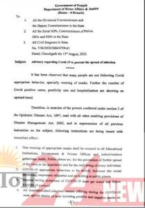 चंडीगढ़ः देश में बढ़ रहे कोरोना वायरस के मामलों को देखते हुए पंजाब सरकार ने नई एडवाइजरी जारी की है। इस दौरान मान सरकार ने एक बार फिर से मास्क पहनना जरूरी कर दिया है। एडवाइजरी जारी करते हुए स्वास्थ्य विभाग ने कहा कि लोगों को चाहिए कि कोरोना महामारी से बचाव और वायरस के फैलाव को रोकने के लिए भीड़-भाड़ वाले स्थानों पर मास्क पहन कर जाएं। पंजाब सरकार ने आदेश जारी करते हुए स्कूलों कॉलेजों, शॉपिंग मॉल और अन्य सार्वजनिक स्थलों पर मास्क पहनने की अपील की है।