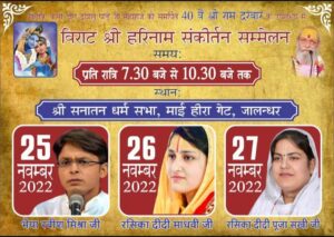 भैया रवीश मिश्रा जी करेंगे हरि नाम का गुणगान, श्री सनातन धर्म सभा माई हीरा गेट में प्रति रात्रि साढ़े 7.30 से 10.30 बजे तक होगा आयोजन