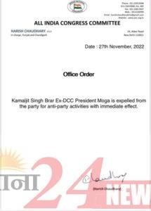 मोगाः जिले से कांग्रेस प्रधान कमलजीत सिंह बराड़ को कांग्रेस ने पार्टी से बाहर कर दिया गया है। कांग्रेस ने पार्टी विरोधी गतिविधियों के आरोप लगाकर सभी जिम्मेदारियों से मुक्त कर बाहर का रास्ता दिखाया है। बराड़ अकसर वारिस पंजाब दे के अमृतपाल सिंह के पक्ष में बयानबाजी करते रहते थे। वहीं वह अपने मोबाइल में जरनैल सिंह भिंडरांवाले की तस्वीर लगाए रखते थे। कमलजीत सिंह बराड़ अकसर प्रदेश प्रधान अमरेन्द्र राजा वड़िंग पर किसी न किसी बात पर टिप्पणी करते रहते थे।