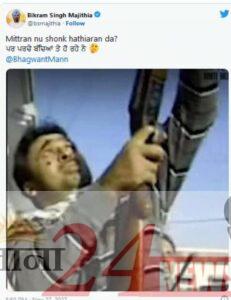 उन्होंने तस्वीर के साथ तंज कंसते हुए कुछ लाइनें भी लिखी हैं। बिक्रम मजीठिया ने सीएम भगवंत मान की एक बहुत पुरानी तस्वीर को ट्वीट किया है। तस्वीर में भगवंत मान दुनाली पकड़े फायर करते नजर आ रहे हैं। ट्वीट में मजीठिया ने सीएम मान पर तंज कसते हुए लिखा है कि मित्रां नू शौक हथियारां दा… लेकिन परचे बच्चों पर हो रहे हैं। उन्होंने इसे सीएम भगवंत मान को टैग भी किया है।