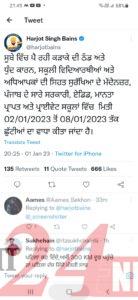 राज्यभर में पड़ रही कड़ाके की सर्दी और धुंध के कारण स्कूली विद्यार्थियों और अध्यापकों की सुरक्षा के मद्देनजर पंजाब के सभी सरकारी, एडिड, मान्यता प्राप्त और प्राइवेट स्कूलों में 2 जनवरी से 8 जनवरी तक सर्दी ऋतु की छुट्टियों में वृद्धि कर दी गई है। इसकी जानकारी शिक्षा मंत्री हरजोत सिंह बैंस ने अपने ट्विटर अकाउंट पर एक पोस्ट के माध्यम से दी है। बता दें कि मौसम विभाग के अनुसार, पंजाब में अगले 2 दिन तक घना कोहरा छाया रहेगा।