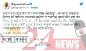चंडीगढ़ः पंजाब के सीएम भगवंत मान ने जमीन पर कब्जा करके बैठे कब्जादारियों को खाली करने की चेतावनी दी है। सीएम मान ने ट्वीट कर कहा है कि पंजाब में जिन लोगों ने पंचायत, शामलात, वन विभाग या अन्य सरकारी जमीनों पर अवैध कब्जा कर रखा है, वे 31 मई तक अपना कब्जा खाली कर दें। क्योंकि अवैध कब्जे से निपटने के लिए पंजाब सरकार 1 जून से सख्त कानूनी कार्रवाई करेगी। मुक्ति अभियान चलाया जाएगा।