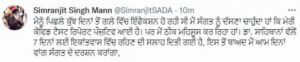 रोजाना24न्यूज़: पंजाब में संगरूर से नए सासंद बने शिरोमणि अकाली दल (अ) के सिमरनजीत मान को लेकर अहम खबर सामने आई है। हाल ही में सिमरनजीत मान की तबीयत खराब हुई थी। लेकिन अब ख़बर सामने आ रही है कि उनकी कोरोना रिपोर्ट पॉजिटिव पाई गई है। जिसके चलते मान ने आइसोलेट कर लिया है। इसकी जानकारी सिमरनजीत मान ने खुद ट्वीट करके दी है कि उनकी रिपोर्ट पॉजिटिव आई है।
