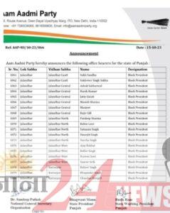 रोजाना24न्यूज: आम आदमी पार्टी ने पंजाब में नए पदाधिकारियों का ऐलान कर दिया है। जालंधर, अमृतसर, लुधियाना, पटियाला, खड्डूर साहिब, होशियारपुर, गुरदासपुर, फिरोज़पुर, फरीदकोट, फतेहगढ़ साहिब, संगरूर, श्री आनंदपुर साहिब, बठिंडा सहित अन्य जिलों में कुल 1619 नेताओं को जिम्मेदारियां सौंपी गई हैं।
