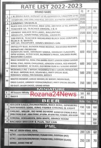 चंडीगढ़ः पंजाब सरकार द्वारा आबकारी निति के तहत शराब और बियर की नई रेट लिस्ट जारी कर दी है। पंजाब सरकार द्वारा शराब के नए रेट जारी कर दिए गए है। जिनके तहत पंजाब में अब इसी रेट के हिसाब से शराब की बिक्री होगी। पंजाब सरकार द्वारा निम्नलिखित शराब के नए रेट लागू किए गए है :-